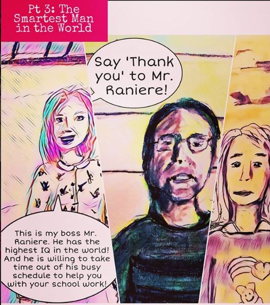 Not only is the art exquisite, but the storytelling is compelling. The entire Raniere fiendish cast are painted here as ghostly, vastly evil images. Pam Cafritz looks particularly sinister. As readers know, this “beloved” NXIVM figure set little Rhiannon up for rape by hiring her to walk her dog so she would be right at home – the home where Pam, Barb Jeske and the dashing world’s smartest man lived.