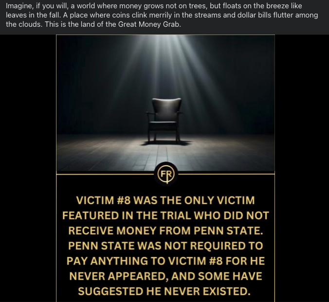 You wrote:The jury believed the judge’s instructions, which told them to ignore the inconsistencies and focus on the volume of accusations. And the volume of accusations was the product of a $65-an-hour therapist, an attorney who rewrote stories on tape, a law enforcement officer who admitted to telling witnesses what to say until they said it, and a financial pipeline that paid accusers between $1.5 million and $20 million from Penn State’s settlement fund. The lowest-paid accuser received $1.5 million. His allegation: Jerry Sandusky hugged him. The highest-paid accuser received $20 million. He was the one the prosecutors personally managed. He had the wildest story. That Sandusky locked him in his basement every weekend for three years, starved and raped him. He screamed for help but the soundproof basement (it was not soundproof) prevented anyone from hearing him.